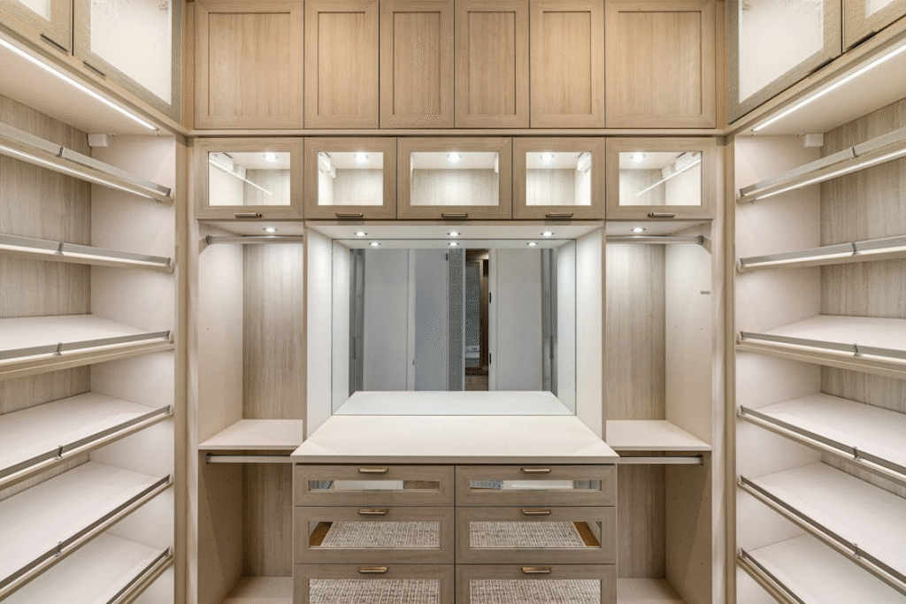 Vertical storage pulls the eye up, makes ceilings feel higher, and rooms feel larger. The key is keeping it sleek and unbroken.